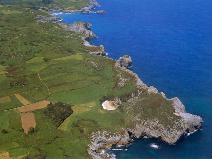 Недалеко от городка Llanos ,что в Астурии, прямо в чистом поле, можно увидеть настоящий песчаный пляж Gulpiyuri ,буквально в 100 метрах от «настоящей» прибрежной полосы. Его особенность в том, что со всех сторон он окружен возвышенностями и кустарниками и нет открытого выхода к морю. А на самом деле все просто — океаническая вода Бискайского залива просачивается через лабиринты подводных пещер. Его протяженность всего 50 метров, но тут даже есть волны, омывающие вот такое чудо природы, всего в 917 км от Дении на север, недалеко от Сантандера.