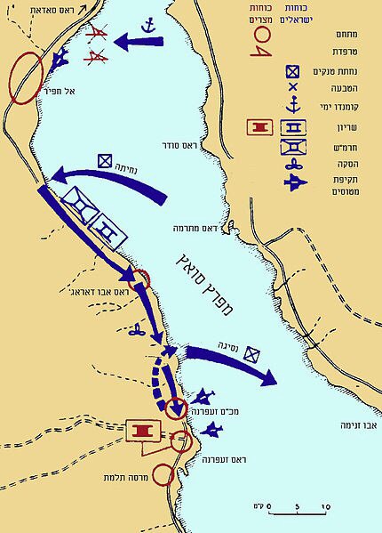 -С рассветом уничтожили несколько машин и вышли к базе египтян с гарнизоном около 150 бойцов, которую взяли сходу при поддержке 130мм береговой артиллерии с территории Израиля и четверки штурмовиков, уничтожив все строения и технику, включая радар.